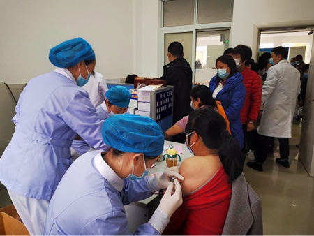 接种现场医务人员根据医院科室分布因地制宜,严格划分等候区、登记区、接种区、留观区。医务人员为大家讲解新冠疫苗接种的注意事项,接种人员接受体温检测后,进入等候区排队,接种流程严格有序,全程闭环管理,秩序井然。同时为防止接种者出现严重不良反应,医院制定了详细预案,1名急救医师全程保障,急救设备及车辆在现场备用。据统计,当天上午共接种新冠疫苗近400人次。