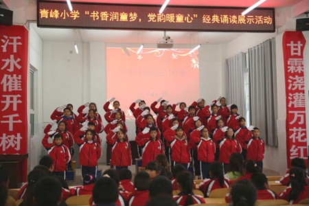 此次展示活动在青峰小学阶梯教室隆重举行,全校以年级为单位,以班级为核心精心组织节目。经典名篇通过老师和学生们的精心编排和精彩演绎,达到了传承与发展的完美统一。优美的意境,激情的诵读为现场献上了震撼心灵的视觉与听觉盛宴,全场不时爆发出阵阵热烈的掌声。作为本次活动的评委老师们认真工作,本着公平、公正的原则,尊重每一位教师和孩子们的付出,认真评分,严肃点评。五(4)班的集体诵读节目《国家》以其恢弘的气势、独特的编排压轴出场,获得了老师们的一致认可。红色的记忆,铿锵的誓言,红色文化在孩子们的血脉中流淌,植根于学生的心灵。