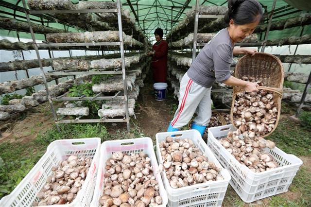今日房县网讯 特约记者 张启龙、刘凤 报道:4月19日,房县红塔镇油坪村,村民汤景梅在采收香菇。她发展香菇6万袋,去年实现收入25万元,带动10户脱贫户增收。