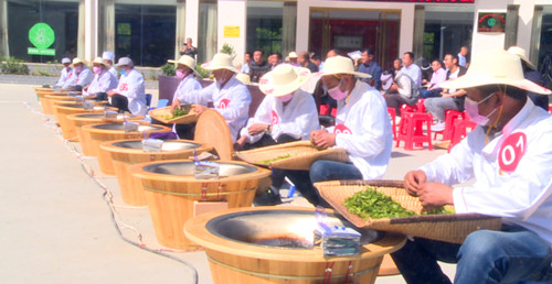 开幕仪式后,28名制茶高手分两轮进行“手工茶制作”比拼。在比赛现场,记者看到,每轮炒茶选手身着加工服在规定时间内严格按照卷曲绿茶手工流程操作,杀青、揉捻、毛火、炒干、提香依次进行。杀青环节,随着新鲜茶叶不断被加热翻炒,茶叶的清香由内而外散发出来。炒茶中,时机和炒茶手法为重点、难点,需要炒茶者高超的技艺,从鲜叶到干茶,全靠一双手控制,选手们在制茶锅上来回捞洒、揉捏,以高超的技术,赢得了现场观众频频点赞。