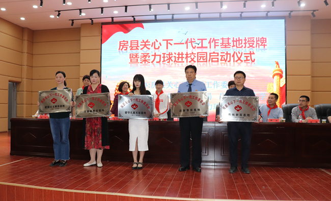 当天,县关工委给房县天明小学、房县军店小学、房县东城小学、房县检察院、房县青峰政治生活馆分别授予“爱国主义教育基地、留守儿童关爱基地、未成年人心理健康教育基地、未成人法制教育基地、未成年人传统教育基地”牌匾。房县关工委还向房县天明小学贫困学生捐赠柔力球拍130副,书包40个,房县老年大学柔力球队现场举行了柔力球示范表演。
