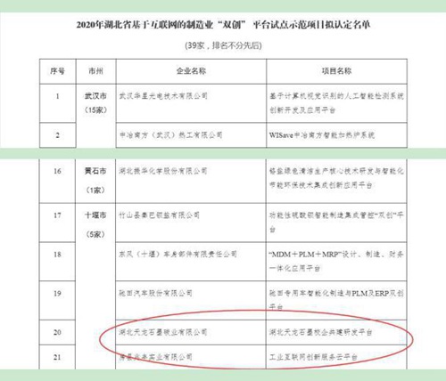 今日房县网讯 通讯员昝鹏飞 报道:日前省经信厅公布了2020年湖北省基于互联网的制造业“双创”平台(企业)试点示范项目名单。十堰共认定有5家,其中房县兆丰实业有限公司(工业互联网创新服务云平台)和湖北天龙石墨碳业有限公司(企共建研发平台)两家企业榜上有名!