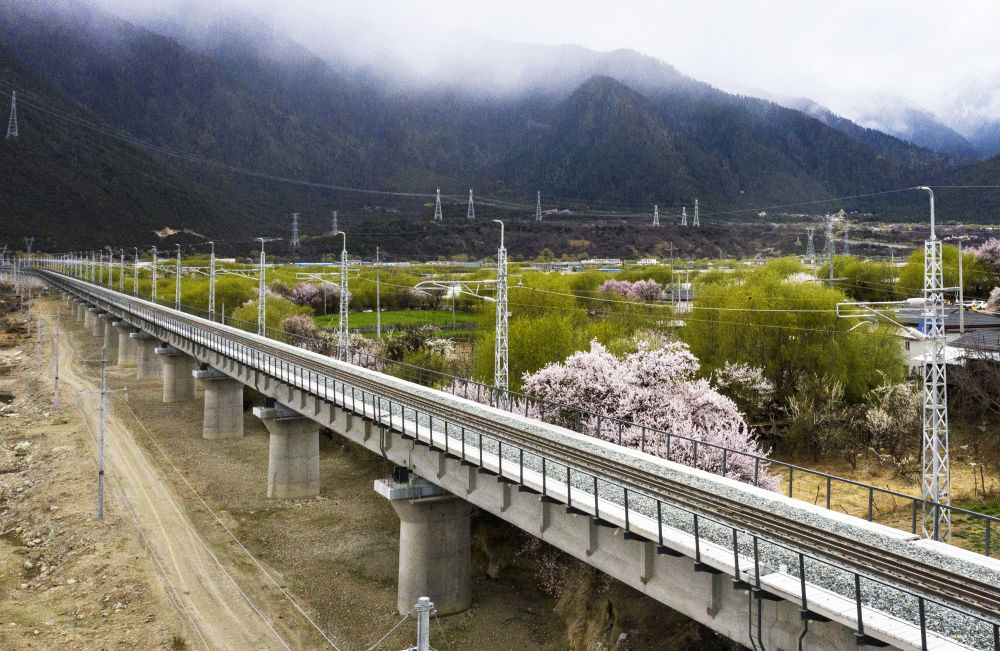 ↑2021年4月1日在林芝市拍摄的拉林铁路(无人机照片)。拉林铁路是西藏首条电气化铁路。