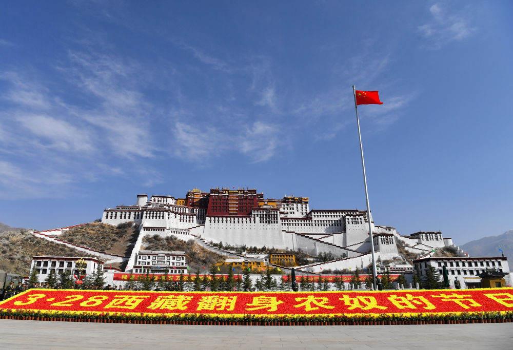 ↑2021年3月28日拍摄的拉萨布达拉宫广场。当日,西藏各族各界群众庆祝西藏百万农奴解放纪念日。