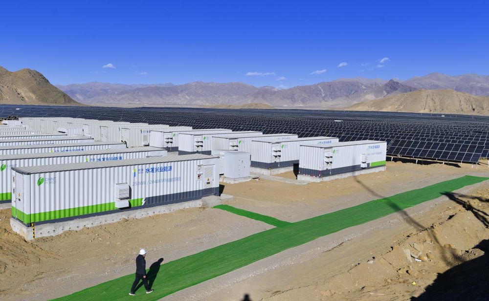↑2020年12月24日拍摄的日喀则市江当现代生态产业示范园内的50兆瓦光储电站储能系统和太阳能光伏组件。