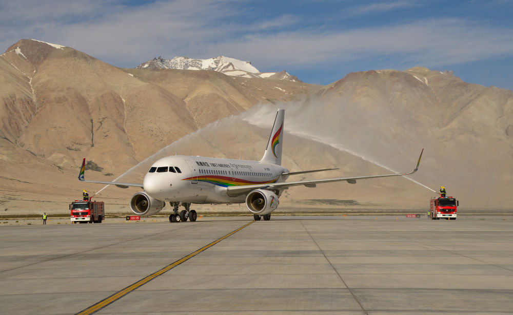 ↑2020年7月1日,阿里昆莎机场通航10周年,西藏航空TV6008客机穿过水门。