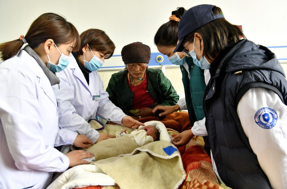↑2021年4月21日,在西藏聂拉木县人民医院,山东省烟台市第五批援藏医疗队队长魏德贤(左二)、护士长崔雯(左一)和当地医院妇产科主任边巴普尺(右二)、妇产科医生扎桑德吉(右一)查房。