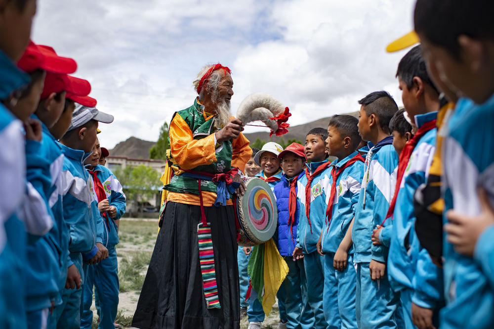 ↑2020年7月2日,国家级非物质文化遗产项目“久河卓舞”传承人尼玛在西藏山南市琼结县下水乡小学进行教学表演。