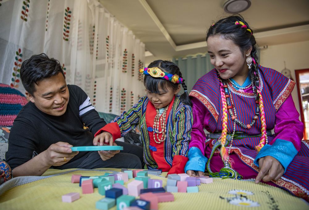 2021年2月11日,在位于西藏林芝市墨脱县的家中,山西小伙张淳焕和门巴族妻子扎西玉珍陪女儿玩积木。
