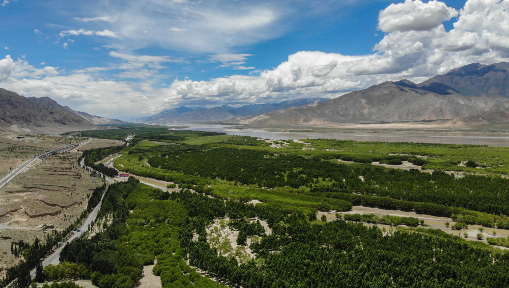 ↑雅鲁藏布江岸边绿树成荫,好似一道绿色长廊(2020年6月27日摄,无人机照片)。时光如雅鲁藏布江奔流
