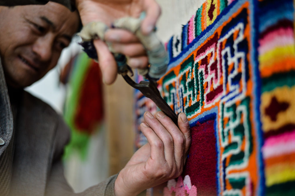 从8岁起就跟着父亲洗毛、捻线的加牙藏毯国家级非物质文化遗产传承人杨永良,2013年在政府支持下成为“加牙藏族织毯技艺传习所”的***。