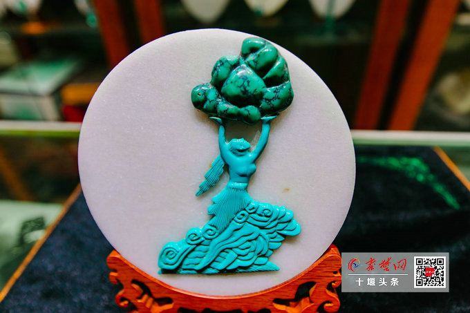 在竹山县内,很多与女娲相关的元素。图为女娲补天绿松石摆件。
