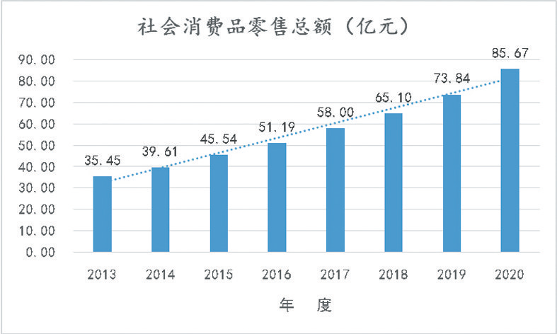 新中国成立初期,县域经济几乎以农业为主,商贸业几乎为零。随着社会主义生产的发展,商品经济不断活跃,为繁荣市场奠定了丰厚的物质基础。特别是党的十八大以来,该县商贸、服务业蓬勃发展,2020年限上商贸企业达67家,全年社会消费品零售总额达85.7亿元,增速居全市第一位。第三产业占 GDP的比重逐年提升,由2013年的占比38.7%,提升至2020年的46.2%。全县融合发展走出新路。一是融合发展刺激消费市场,4A、3A旅游景区成功创建,“一街一村”开业运营,电子商务进农村项目顺利实施,便捷对接“一带一路”,房县产品畅销全国。二是推进积极的就业政策,支持农民工返乡就业创业,新增就业再就业3.1万人,实现了农民增收,促进了消费市场供需水平不断提升。