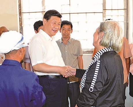 2013年7月11日至12日,习近平总书记在河北省调研指导党的群众路线教育实践活动。图为习近平在平山县西柏坡革命旧址同当地群众握手交谈