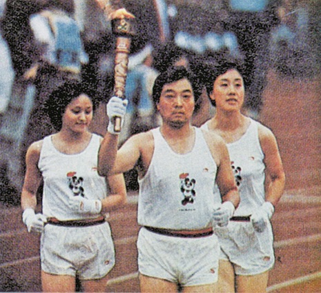 中国著名射击运动员许海峰高擎火炬,在跳水运动员高敏(左)和原女排世界冠军队成员张蓉芳(右)护卫下进入会场点燃主火炬