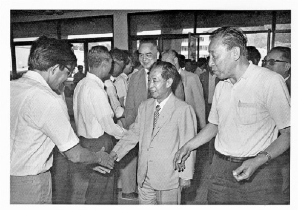 1984年5月23日,胡耀邦到深圳考察。考察期间,他为深圳书写了“特事特办、新事新办;立场不变、方法全新”的题词。图为胡耀邦(前排右二)会见蛇口工业区的干部职工
