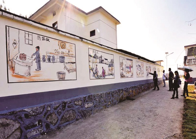 乡风文明——群众站在干净整洁的街道上,观看墙上的宣传画