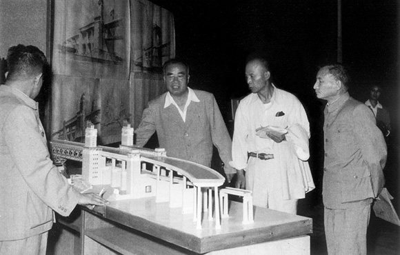 1960年6月,陈云、吕正操、朱德(从右至左)在上海观看南京长江大桥的模型