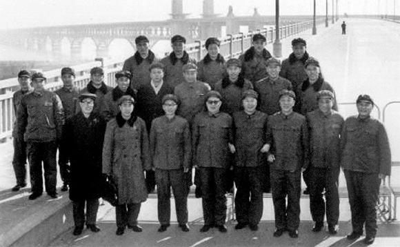 1975年11月,时任南京军区副政委的王恩茂(前排右三)与解放军三总部及南京军区领导在南京长江大桥上合影