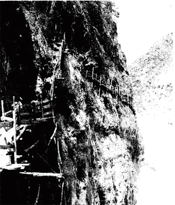 修建宝成铁路时,在悬崖绝壁上架起了通往工地的栈道