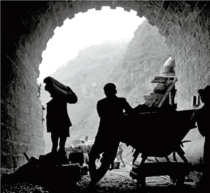 1953年9月,工人在嘉陵江上游的一处隧道内施工
