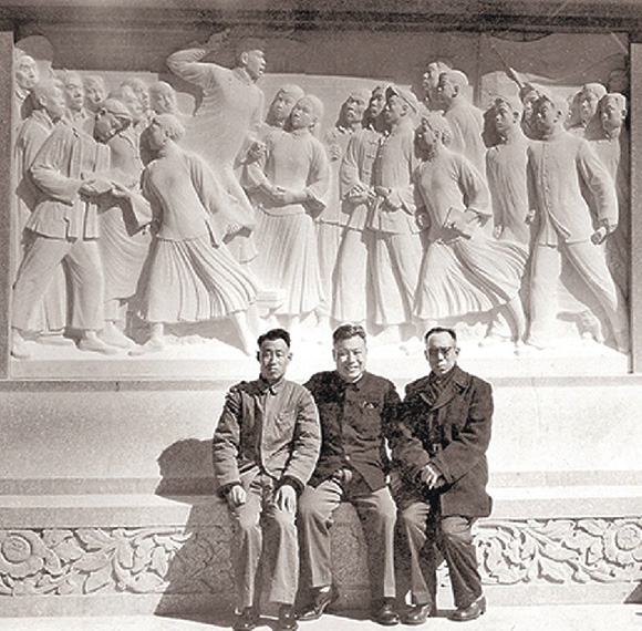雕刻人员在人民英雄纪念碑浮雕下合影
