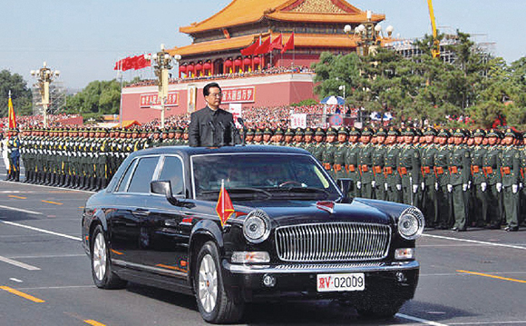 2009年10月1日,在国庆60周年阅兵式上,胡锦涛乘坐红旗轿车检阅部队