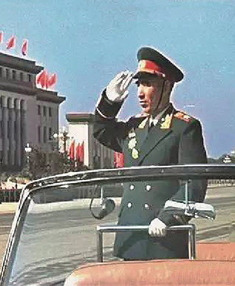 1959年10月1日,国庆10周年庆典上,林彪乘坐红旗敞篷车检阅三军