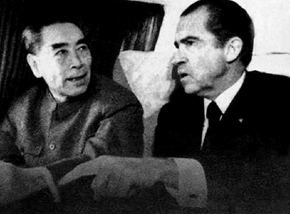 1972年,美国总统尼克松访华,周恩来率红旗轿车国宾车队到机场迎接。图为周恩来和尼克松在红旗轿车内交谈