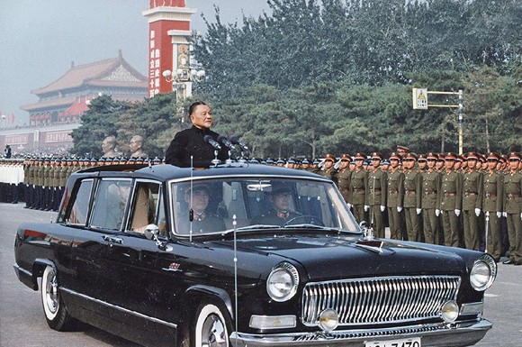 1984年10月1日,在国庆35周年阅兵式上,邓小平乘坐红旗轿车检阅部队