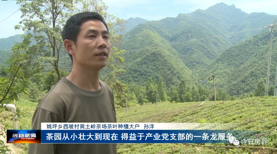 姚坪乡西坡村黄土岭茶场茶叶种植大户 孙洋: 这是我的茶园,一共有65亩,茶园从小壮大到现在,得益于产业党支部的一条龙服务,得益于党员的技术指导,现在年产值将近20万。