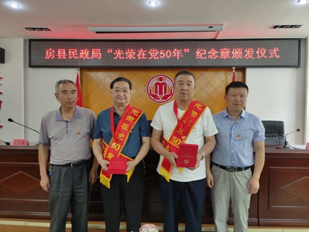 今日房县网讯 通讯员 任莎莎 柯辉 代全超 报道:为庆祝中国共产党百年华诞,表彰“光荣在党50年”老党员,6月29日,房县民政局组织离退休老党员和部分青年党员开展“光荣在党50年”纪念章颁发等系列活动。