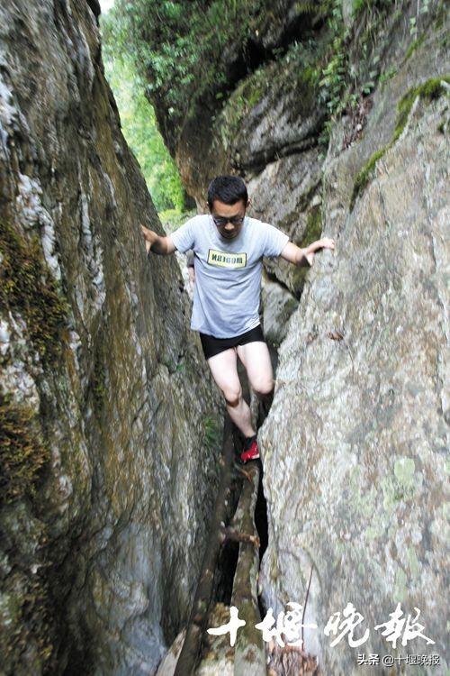 前行约一个小时后,一处落差超过2米的跌水拦住了去路。一行人绕到岸边,只见一个房屋大小的巨石裂成两半,中间的缝隙刚好能容一人通过。底部是绿得发暗的深潭,好在缝隙两头搭有两棵枯树供人通行。记者背着双肩包、挎着相机踩上枯树,双手抵着石壁小心翼翼地挪动脚步,不料左脚踩的一棵枯树突然掉落,身体迅速下跌。本能地扭转身体,记者杂耍般地骑在另一棵枯树上。在众人的惊呼声中,确认背包、相机安全后,记者长出了一口气。