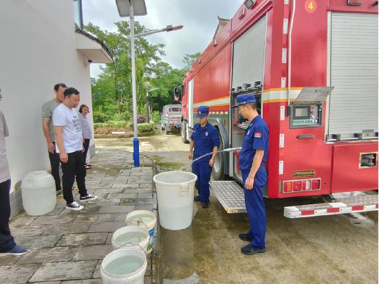 据悉,消防队每日出动消防罐车两次为回龙乡集镇送水,每天送水24吨。为确保群众每天能有干净的生活用水,消防队队员表示,我们会每天坚持为回龙乡送水,直到供水管道修复、恢复供水为止。