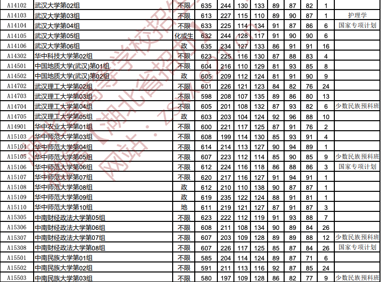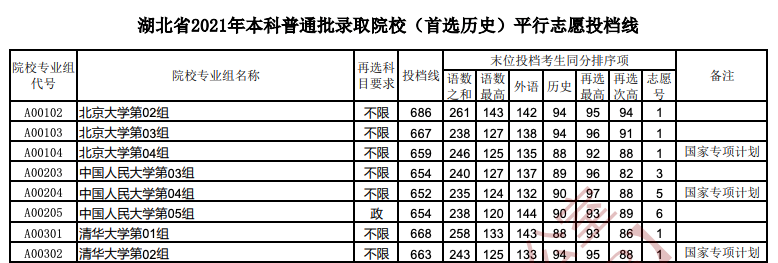 湖北省2021年本科普通批录取院校(首选历史)平行志愿投档线