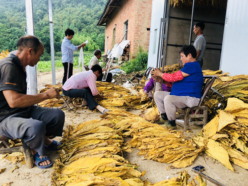 烤房门前,烟农们正忙着编烟上竿、开炉烘烤,现场一派热火朝天的丰收景象。烤烟大丰收不仅能给烟农们带来最直接的经济收益,更带动了村内其他村民增收,让在家务农的村民在农闲时有了额外的收入,一片片烟叶成为了当地村民们增收致富的“黄金叶”。