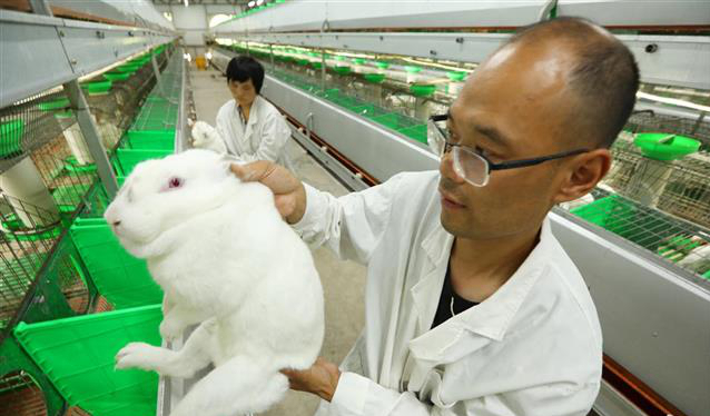 图为房县窑淮镇西沟村茶山兔股份有限公司技术人员在养殖基地观察肉兔生长情况。据介绍,该基地每月订单式向四川省市场客户供应肉兔10000只。