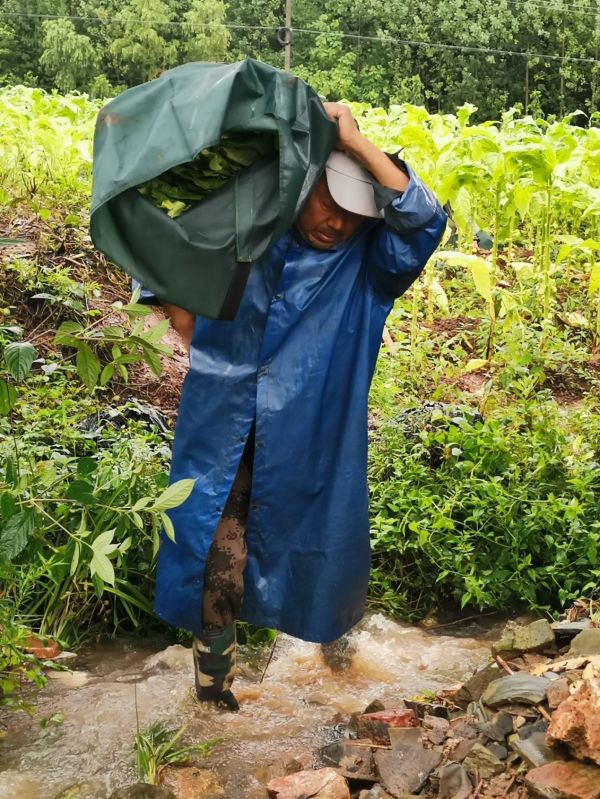 “以前,我们经常使用麻袋片,随便丢弃的口袋作为包烟的辅助工具,虽然对烟叶有一定的保护作用,但是效果十分有限。在烟叶采摘、运输、编烟的过程中,都很容易产生鲜烟叶的机械性损伤,出现烟叶青痕现象,不利于后期的烟叶收购与烟农增收工作。”西坪村驻村技术员饶崇宇听见我们的谈话,饶有兴致地向我解释道。
