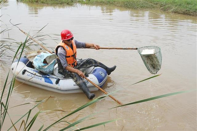 今日房县网讯 特约记者 张启龙 刘凤 摄:9月3日,房县军店镇月明村农民“河长”陈光亮在马栏河双柏段捡拾洪水冲刷滞留的垃圾,他一连7天都在马栏河军店区域清理河面漂浮物。该县境内314条河流穿越农村,巡河护河点多面广,为发挥“农民军”人多优势,当地采取乡镇、村(居)负责制,以乡镇管辖区域河段为单元,选配责任心强的农民担任“河长”,这些农民“河长”居住地离河较近,便于护河保洁河流。