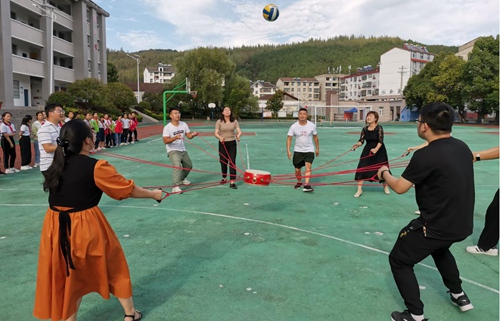 趣味运动会,快乐教师节。为了教师间的凝聚力和合作意识,让老师们愉快而充实地度过教师节,9月9日下午,青峰小学组织了全体教职工的趣味活动。所有教师以年级组为单位,分成6个小组,每个人都参与到活动中,活动持续了一个多小时,校园内充满了老师们的欢声笑语。其中,同心协力,击鼓颠球活动受到了大家的一致欢迎,老师们的热情高涨。