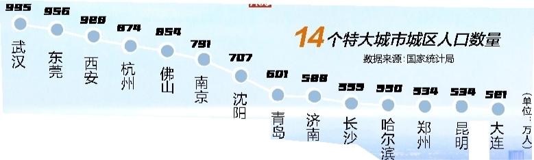 数据显示,我国超大城市增至7个——上海、北京、深圳、重庆、广州、成都、天津;特大城市增至14个——武汉、东莞、西安、杭州、佛山、南京、沈阳、青岛、济南、长沙、哈尔滨、郑州、昆明、大连。其中,中部最大城市、大区中心城市武汉城区人口规模达到了995万人,距离城区人口1000万人的超大城市门槛仅差5万人。