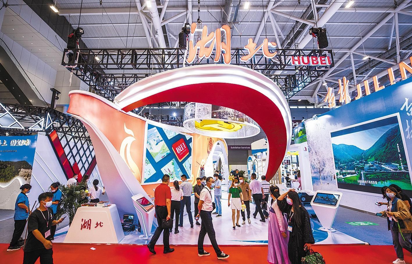 文博会湖北馆设计以楚凤和长江为视觉主元素,辅以城市剪影、风景名胜的意象。 (湖北日报全媒记者 柯皓 摄)