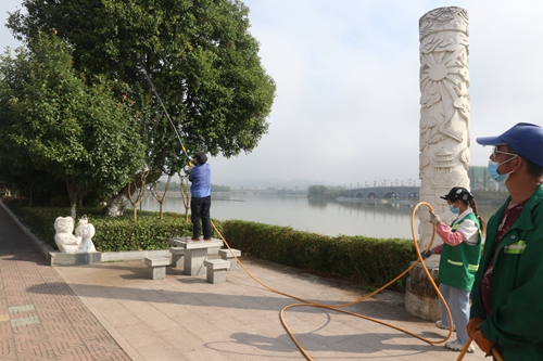 在滨河大道,一辆园林洒水车正在作业,三四名园林工人正相互配合着为行道路上的树木喷洒药物。节日期间,这群忙碌的背影在这个喜庆的环境里似乎格外醒目,但对于他们而言,这个国庆节与平时没什么不同。