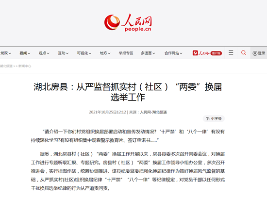 据悉,湖北房县村(社区)“两委”换届工作开展以来,房县县委多次召开常委会议,对换届工作进行专题听取汇报、专题研究。房县村(社区)“两委”换届工作领导小组办公室,多次召开推进会,实行挂图作战,统筹协调推进。该县纪委监委把强化换届纪律作为抓好换届风气监督的基础,从严抓实村(社区)组织换届纪律“十严禁”“八个一律”等纪律规定,对党员干部以任何形式干扰换届选举纪律的行为从严追责问责。