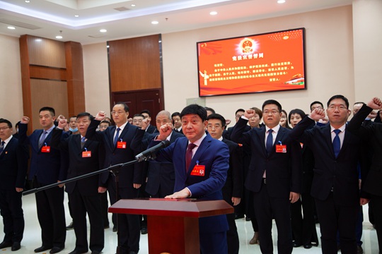 闭幕式后,县委书记纪道清主持宪法宣誓仪式。新当选的县人大常委会主任、副主任、委员,县人民政府县长、副县长,县监察委员会主任,县人民法院院长面向国旗,庄严宣誓。