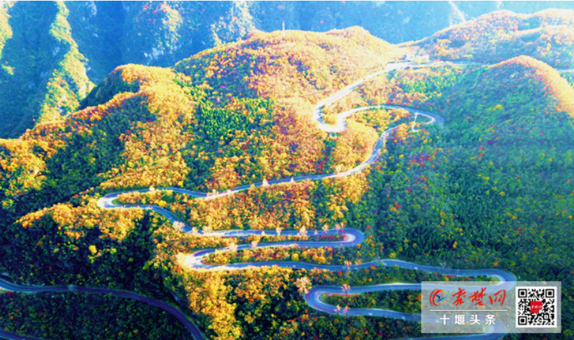 房县十回首公路,位于房县野人谷镇境内,旁边就是房县4A级景区野人谷和野人洞。秋冬时节,公路如丝带般从谷底盘旋而上,经过十道弯到达山顶,攀升高度超过百米,公路两旁层林尽染,五彩斑斓,美轮美奂。