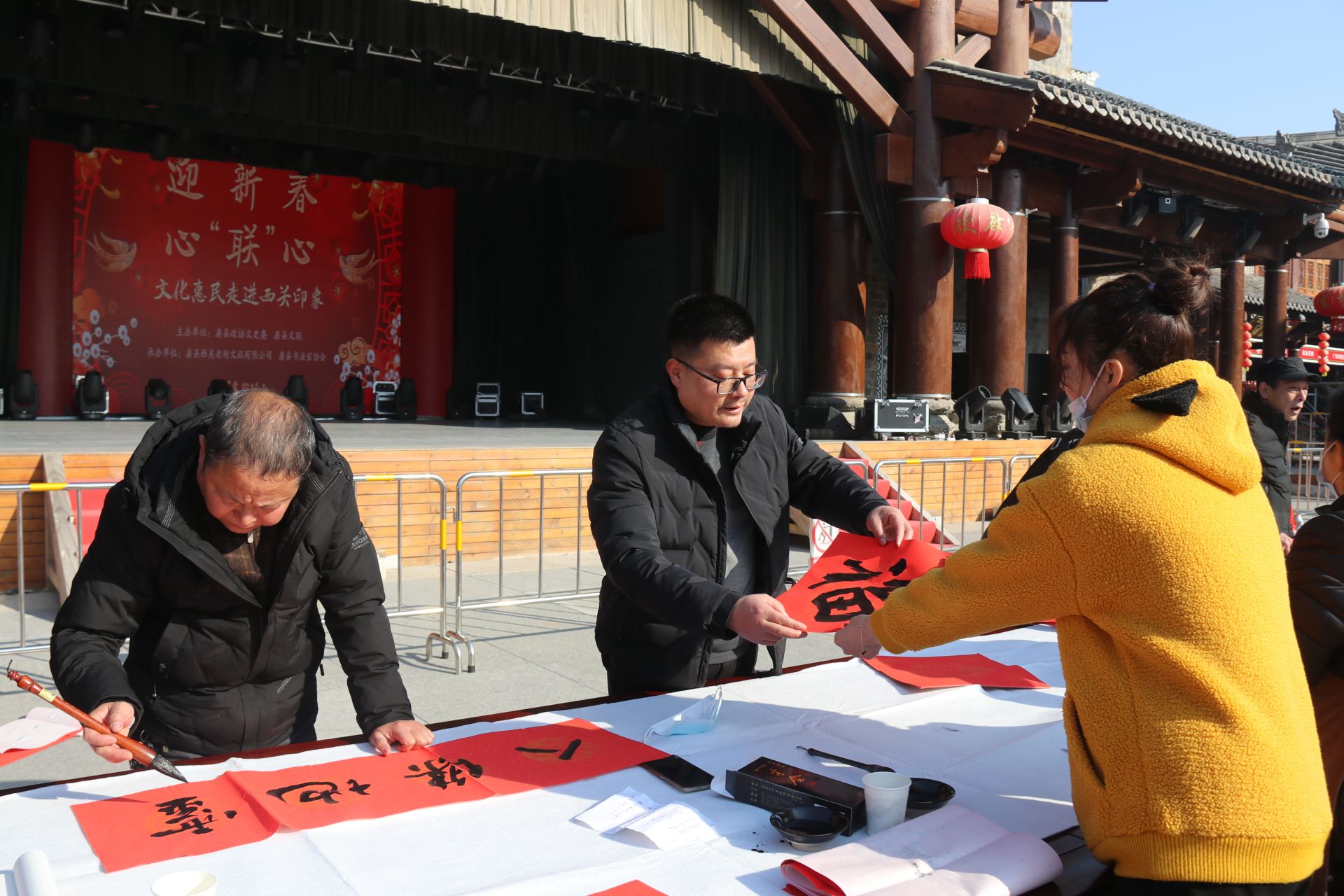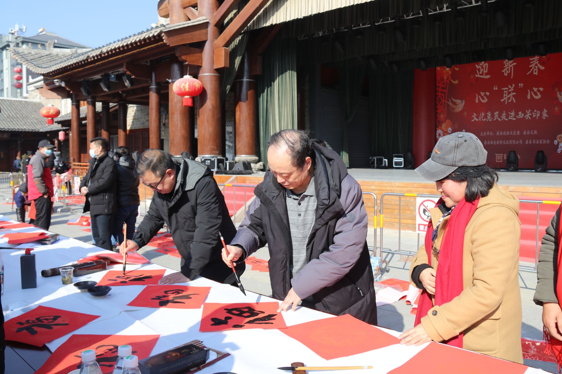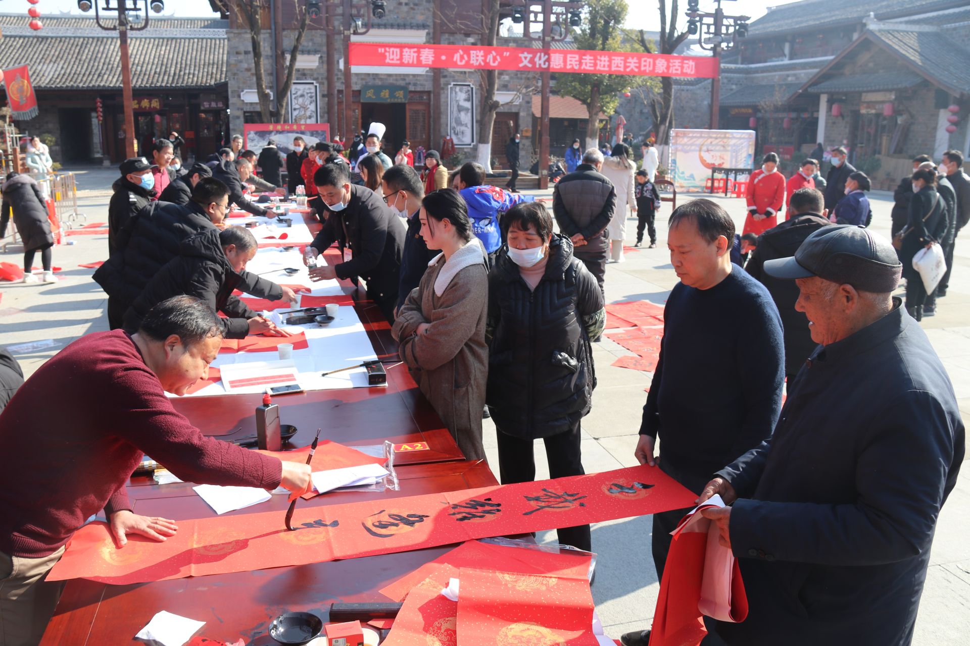 今日房县网讯 记者 绳晓 通讯员 董炎林 报道:1月1日,房县新时代文明实践文化文艺书法家小分队10多名文艺志愿者来到房县西关印象百戏楼开展“庆元旦•心‘联’心”文化恵民活动,本次由房县政协文史委、房县文联主办,房县西关文旅、房县书法家协会、房县听涛书画院承办的志愿服务活动,书家现场挥毫泼墨,为游客及居民群众赠送春联、福字500多副。