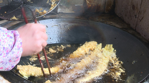 张阿姨首先要炸的是卷卷,这是家中老小最爱吃的炸货。先用猪五花肉剁肉馅,加小葱、嫩姜和盐调味儿,再用豆油精皮包裹卷起,然后滚鸡蛋淀粉浆,下油锅,不到一分钟的时间卷卷就由淡黄色变成金黄色,顿时家中香气四溢,让人垂涎三尺。