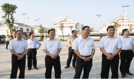 8 月 14 日至 15 日,全省竹房城镇带城乡一体化试验区建设现场会在房县召开。图为省委副书记张昌尔一行调研回龙乡扶贫开发整乡推进搬迁现场(军店镇双柏小区)。市委书记周霁,县委书记沈明云,县委副书记、县长朱光洪等市县领导陪同调研。