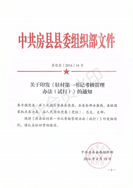 关于印发《驻村第一书记考核管理办法(试行)》的通知-今日房县网-- 房县门户